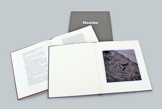 Guide is a limited edition artist’s book, signed and numbered by the artist. Each book is specially handbound as two hardcover volumes enclosed in a slipcase. Volume I contains the conversation between the artist and his mentor, and Volume II contains a suite of ten original black and white photographs documenting the journey along the California coast.