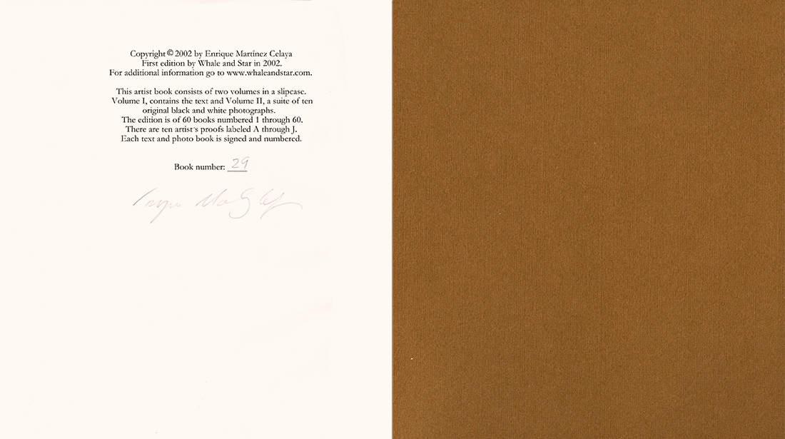 2002. Text and photographs by Enrique Martínez Celaya. Two hardcover volumes with slipcase. Volume I (the text) 140 pages. Volume II (a suite of 10 original black and white photographs). Edition of 60.